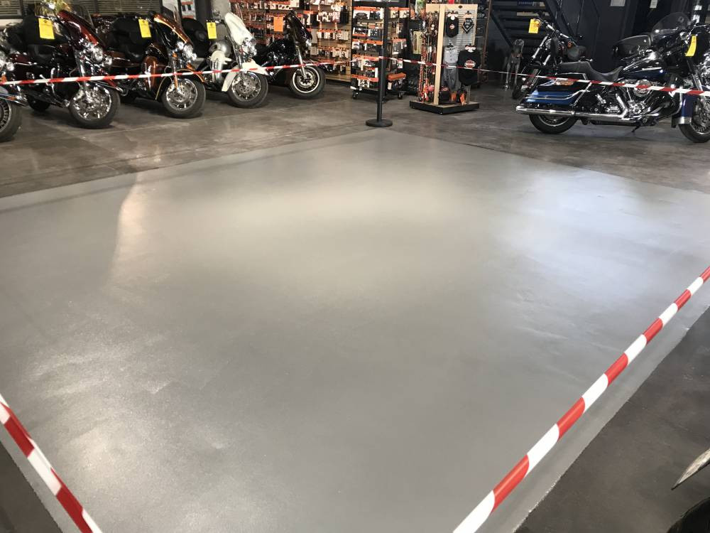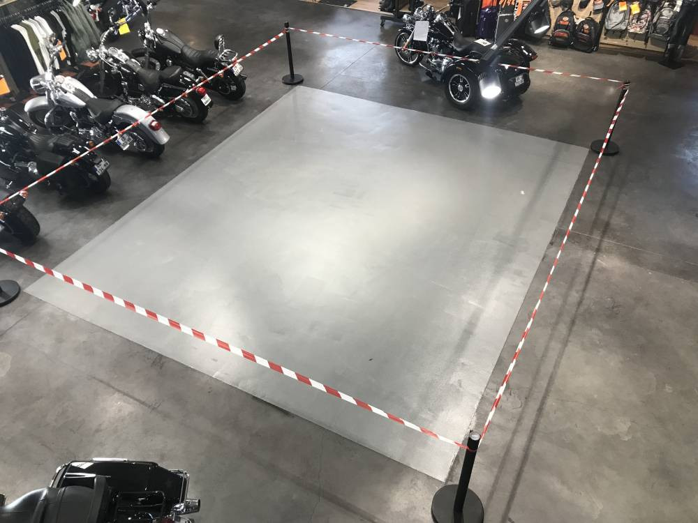 Notre client, une marque de moto prestigieuse, voulait réaliser une partie de son showroom avec un mortier époxy afin de mettre en valeur ses machines. L'aspect esthétique était primordiale. Nous avons donc réalisé un mortier epoxy autolissant avec coating anti rayure, en choisissant une teinte RAL définie.