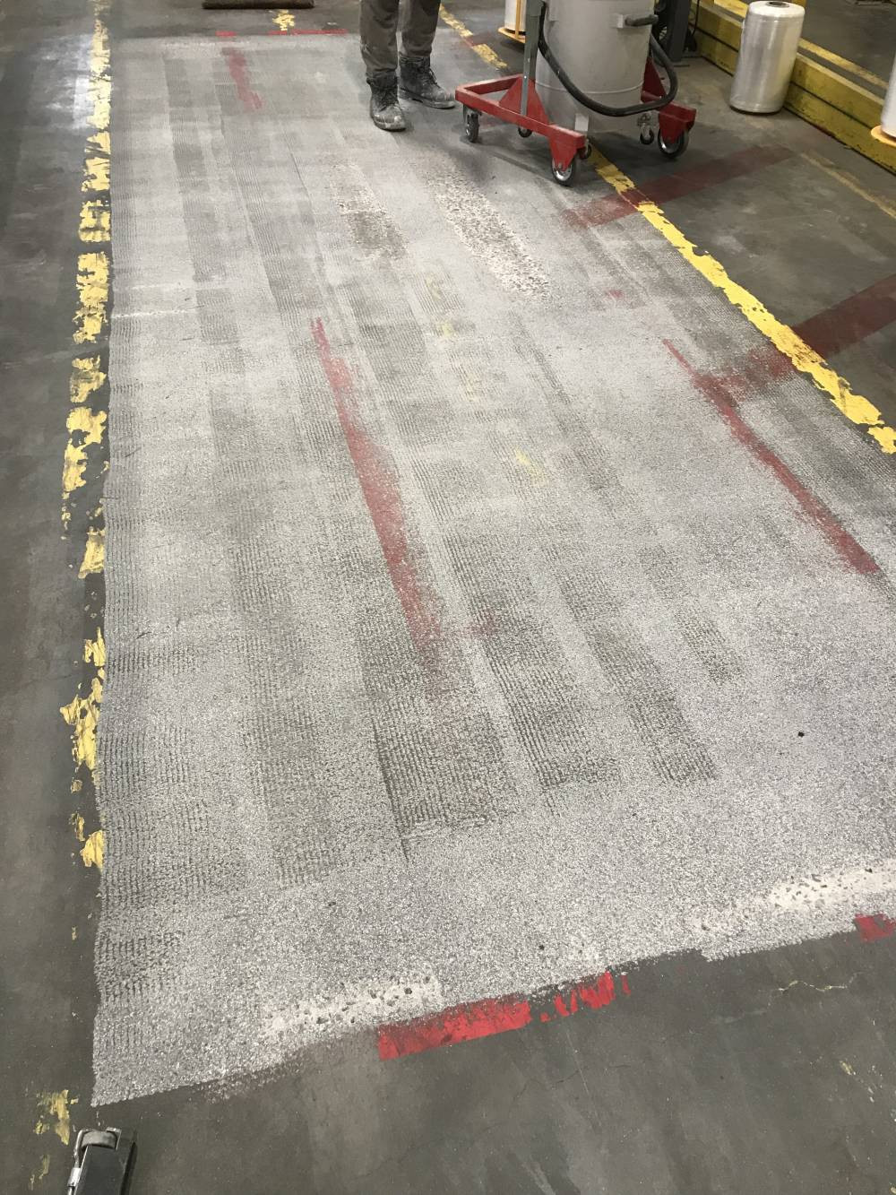 L'opération consiste en un rabotage et d'une aspiration soigné du support, suivi de la mise en oeuvre d'un autolissant de 5mm d'épaisseur en une seule passe avec une couche de fermeture agrémenté d'un antidérapant léger.